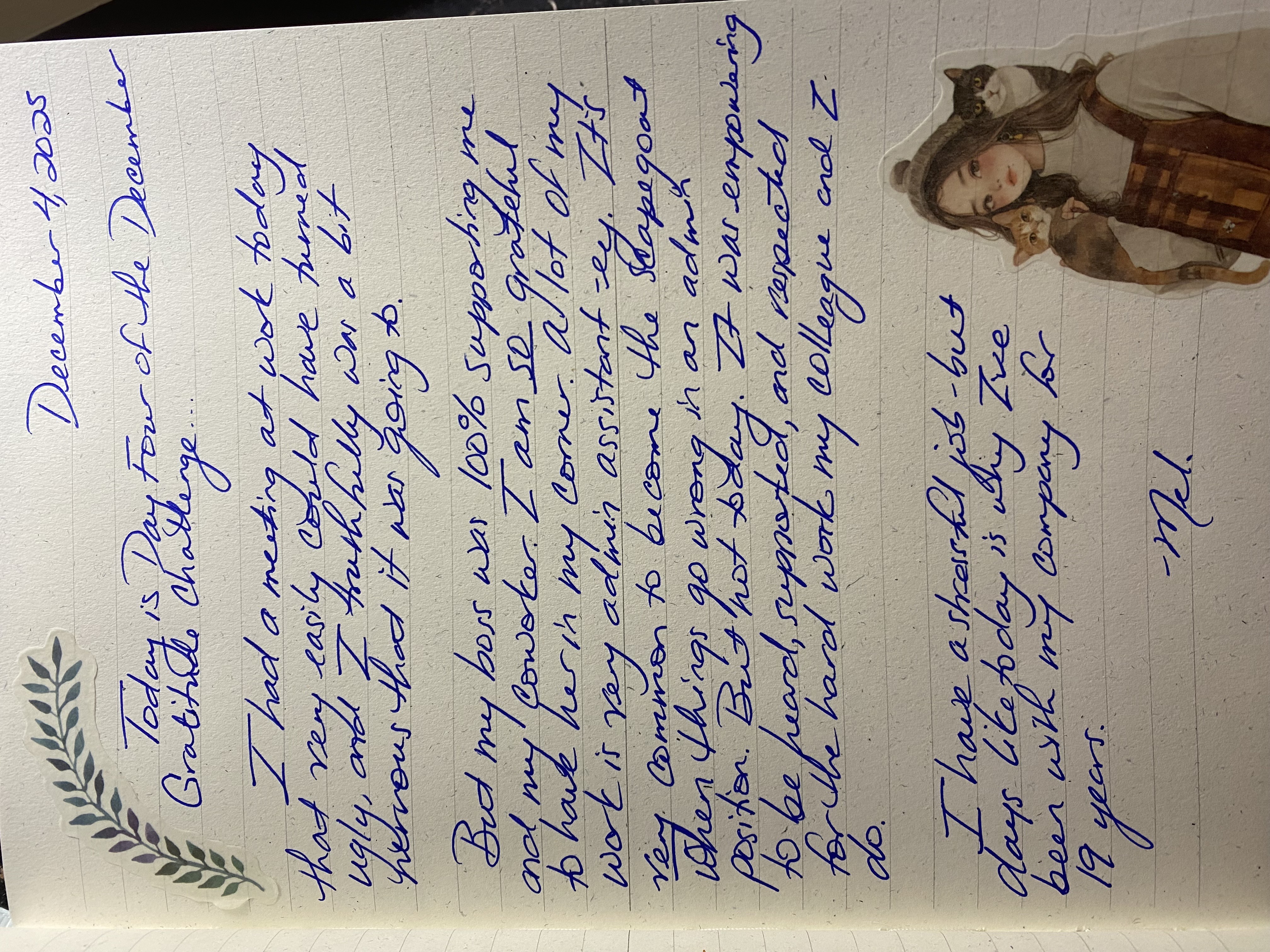 Day Four of The December Gratitude Challenge... translation of my scribbles below the photo.