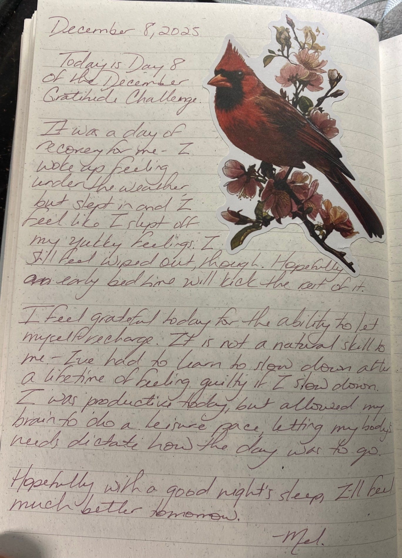 I feel grateful today for the ability to let myself recharge. It is not a natural skill to me - I’ve had to learn to slow down after a lifetime of feeling guilty if I slow down. I was productive today, but allowed my brain to do a leisure pace, letting my body’s needs dictate how the day was to go.