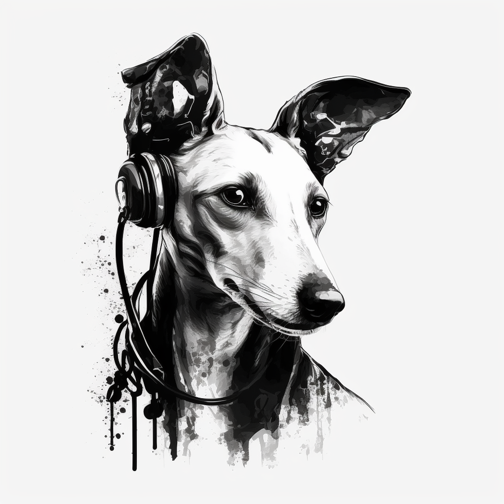 Whippet with headphones, mottled style, clean, simple, white background, professional tshirt design vectorEnclosed in a circle
