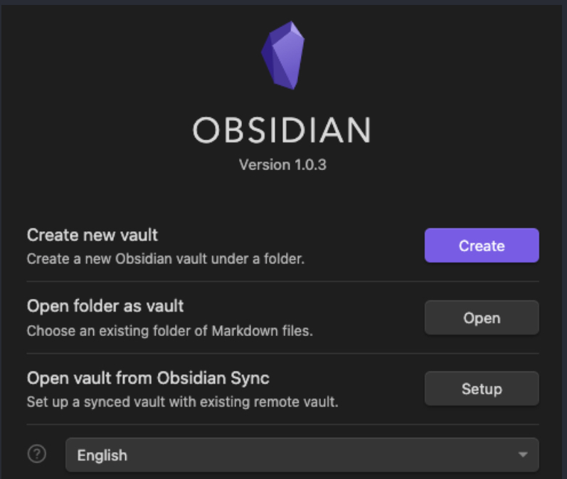 Khi bạn mở Obsidian, bạn sẽ nhìn thấy màn hình như bên dưới. Bạn hãy nhấn vào tuỳ chọn "Create a new vault". Vault thực chất là những thư mục (folder) mẹ được lưu trữ trong máy tính của bạn, và trong Obsidian thì nó được gọi là một vault.