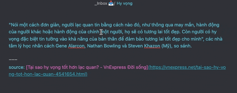Bạn có thể lấy một chủ đề bất kỳ mà bạn hứng thú để thực hành ngay trong khi đọc bài hướng dẫn này. Giả sử, sau khi đọc một bài báo trên VnExpress về chủ đề: Hy vọng và lạc quan, tôi muốn tìm hiểu thêm về hai khái niệm này và ghi chép vào cơ sở kiến thức của tôi trong Obsidian.